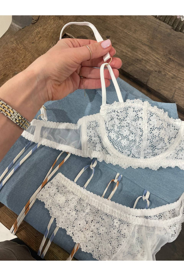Комплект з м’якого мережива з квітковим візерунком та невагомої сітки. Каркасний бра з регуляторами адаптується під різні об’єми, забезпечуючи точну посадку. Трусики-бразильяна м’яко окреслюють стегна, формуючи елегантний та зручний силует.