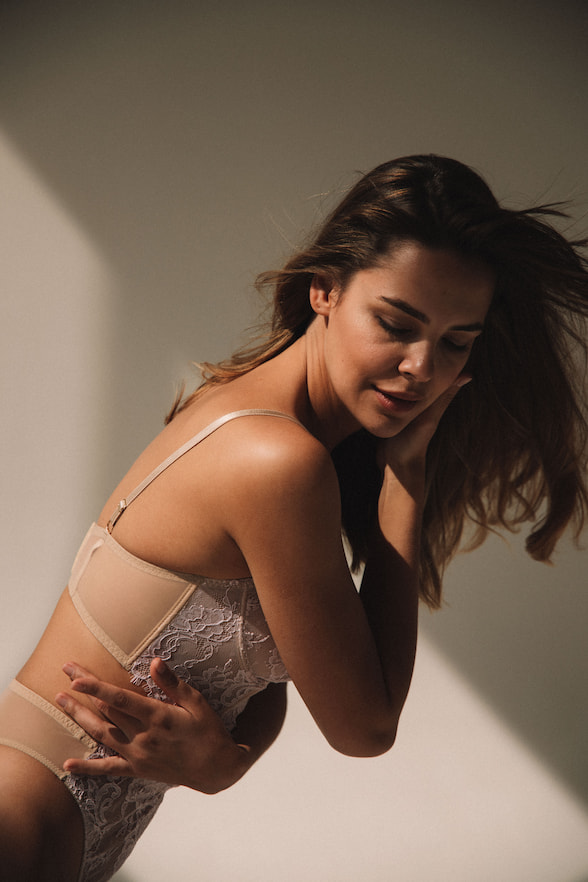 Комплект каркасної посадки з витонченого мережива у ретро стилі. Ідеальний варіант як для маленьких, так і для великих об'ємів. Трусики у двох варіантах — стрінги та бразильяно.
