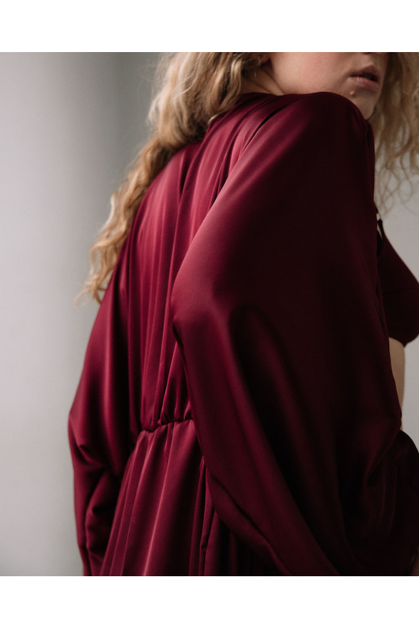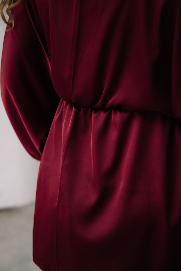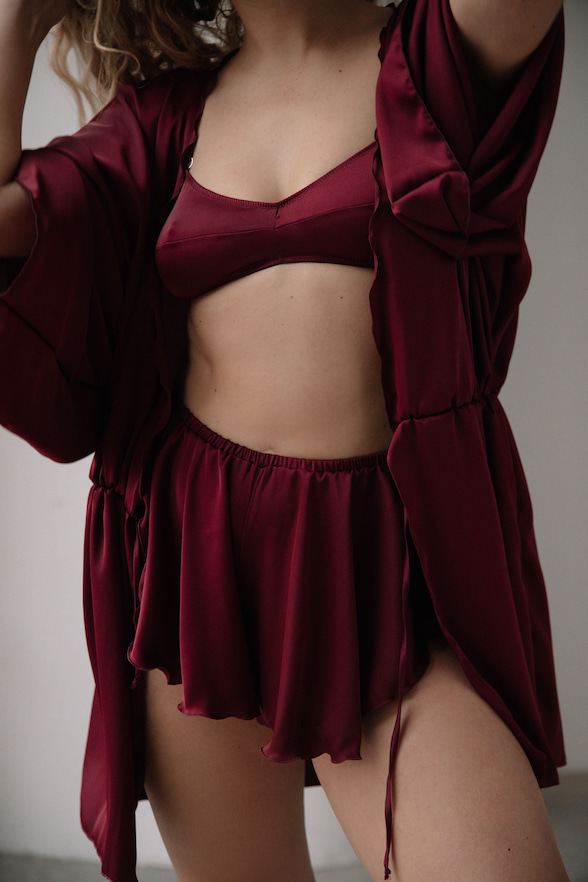 Комплект із натурального тутового шовку в кольорі бордо. М’який бра без кісточок і трусики створюють комфортну базу, а легкі шортики додають легкості. Кімоно на зав’язках акцентує талію та красиво підкреслює силует. Тканина має гладку текстуру та легкий шовковий блиск.