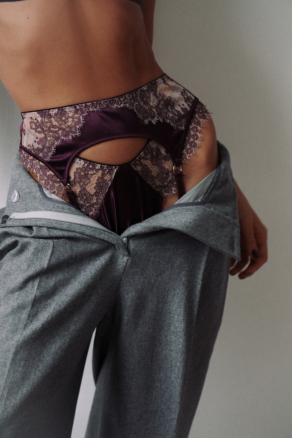 Комплект виконаний у глибокому відтінку plum та поєднує французьке мереживо з матовим сатином, створюючи виразний, але елегантний силует.Бюстгальтер: • форма балконет • мереживні чашки з підкріпленням для м’якої підтримки • регульовані бретелі та класична застібка ззадуТрусики бразильяно: • спереду сатин з мереживною вставкою • ззаду — м’яка сіточка, що повторює лінії тіла • еластичні регульовані елементи для комфортної посадкиДодатково:За бажанням комплект можна доповнити поясом для панчіх, виконаним у тому ж поєднанні сатину та мережива. Пояс акцентує талію та має регульовані кріплення для панчіх.